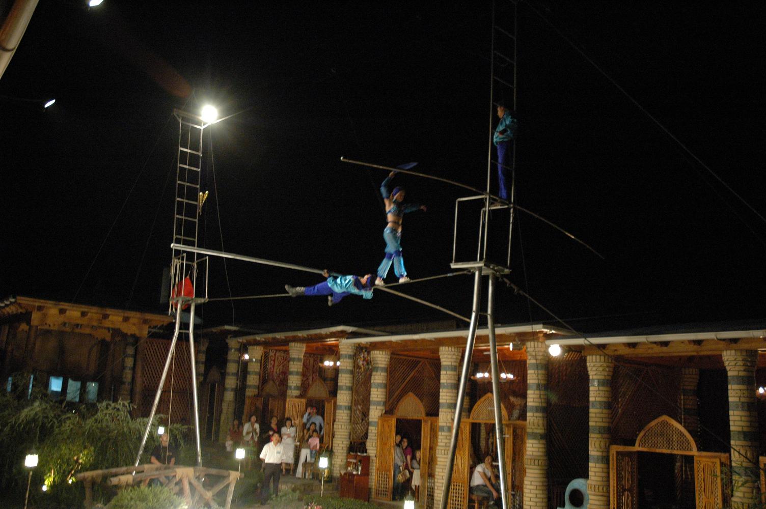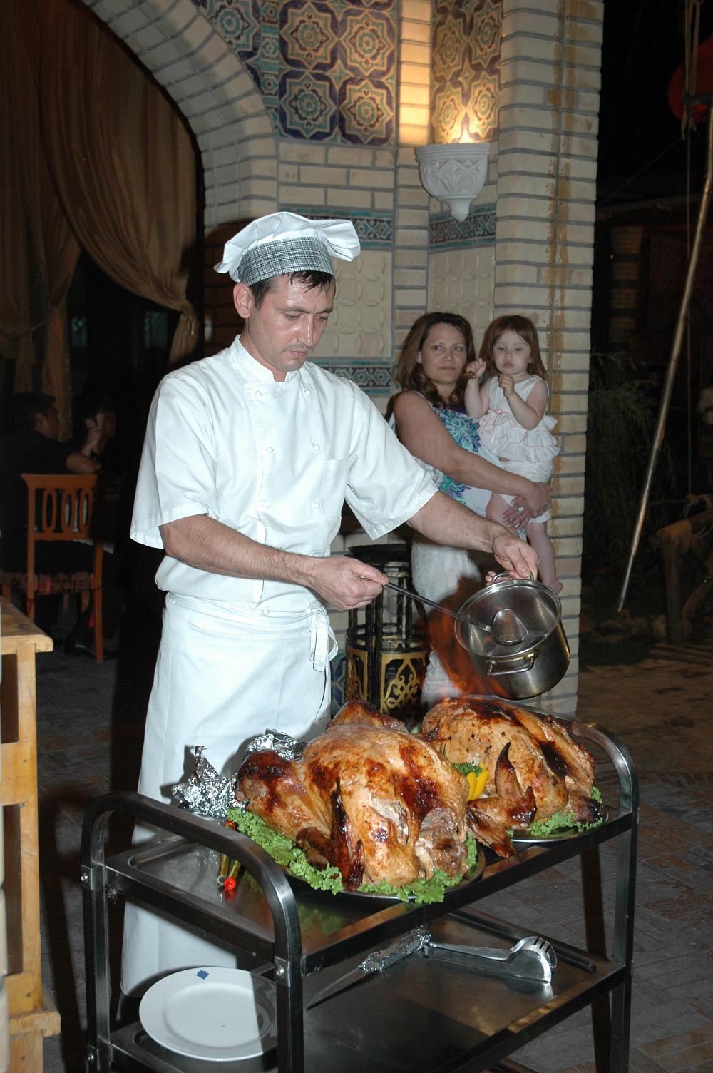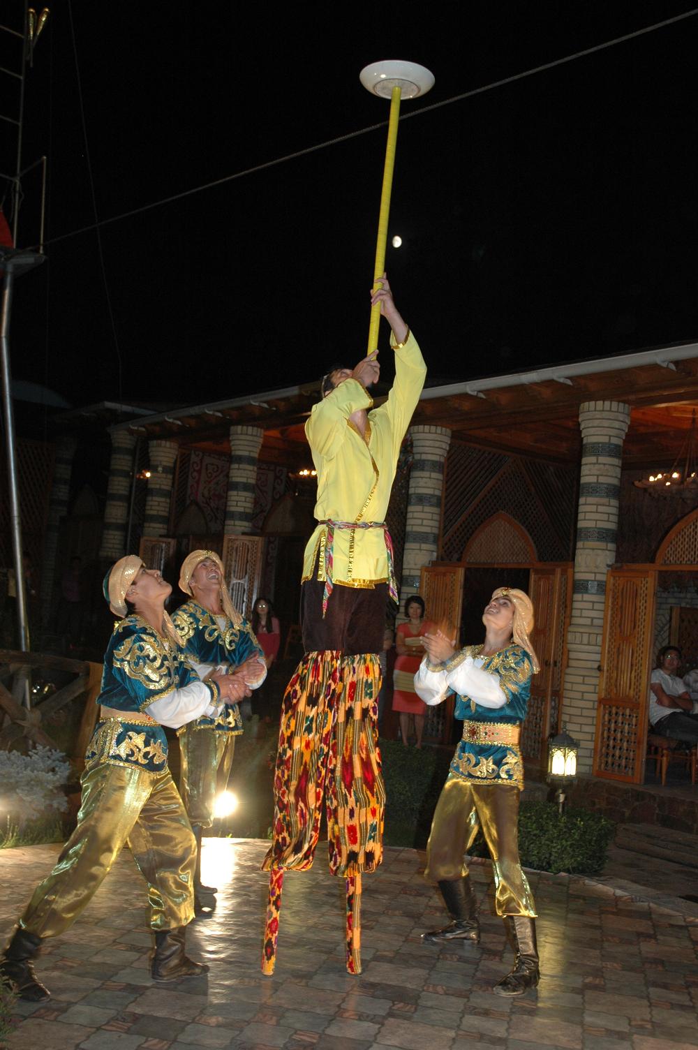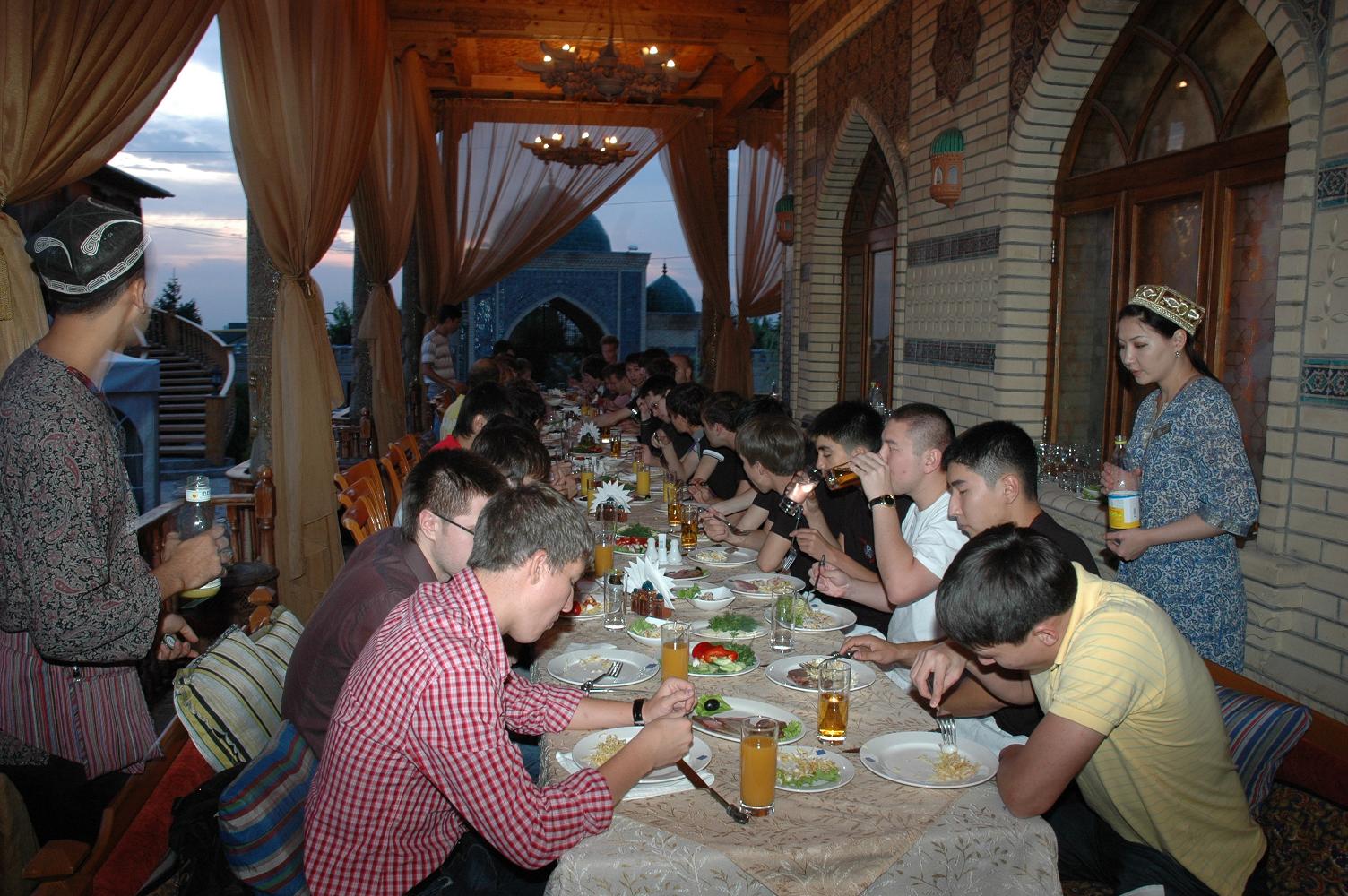 До ужина у нас было около 50 минут на умывания-переодевания, которые я решил потратить на то, чтоб повалятся на кровати и чутка отдохнуть. Ну и естественно после постоянных недосыпов на этой кровати я и отрубился. Благо что за 5 минут до назначенного времени мой разум решил меня пробудить, и я быстренько сорвавшись переоделся и спустился к автобусу, который должен был направить нас к узбекскому ресторану, название которого я к сожалению не помню. Скажу честно - я бы не простил себя если бы проспал ужин в таком ресторане. Это просто мего-крутое заведение. Нас как обычно кормили не то что первым и вторым, тут наверное доходило до седьмого, восьмого и девятого. Тут и какие-то узбекские национальные блюда, и плов, и конина, и индейка. Чего там вобщем только небыло. У всех было просто высшее настроение, все очень много шутили, болтали, смеялись. Так же стоит отметить что в ресторане постоянно кто-то выступал и не давал нам заскучать. То какие-то танцоры, танцорши, то какие-то трюкачи на ходулях, то воздушные акробаты. Но время было позднее и VP с Kerch.net нужно было ещё отыграть шоу-матч за 2000$, но почти все игроки хотели посидеть подольше. Ведь на то время ещё не подали самое главное - индейку, которую так все хотели, а особенно LeX. Ведь конину он не ел, так как коняжек любит и катался на них в детстве :) На вопрос о том, катался ли он в детстве на индейках он в шутку ответил, что бывало но от мяска её все равно не откажется.