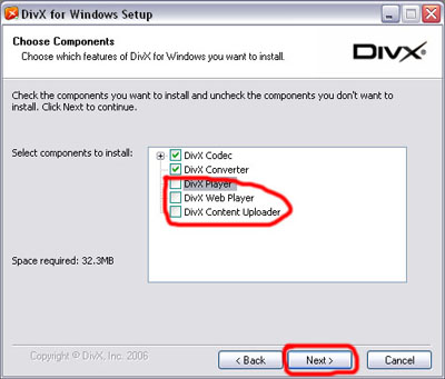 6) Убираем галочки со всего, кроме DivX Codec и DivX Converter и жмем Next;