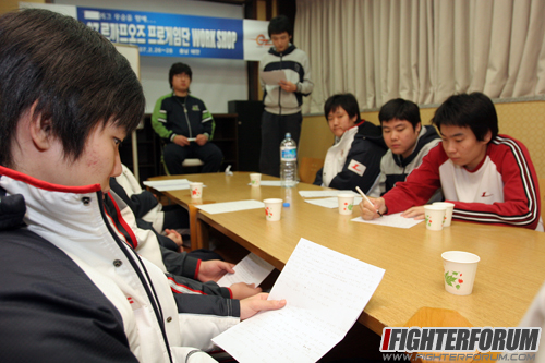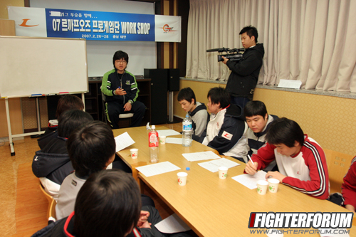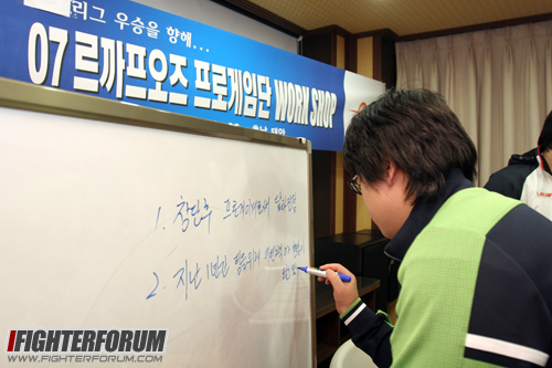 Оглядываясь назад и двигаясь вперёд в 2007 год, Ли Юсок6 поднимает большой палец Ким Чжонъхвану7, посмотрев на его цели.