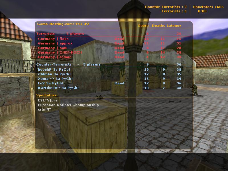 Сборная Германии играет экономический раунд. На этот раз атака террористов устремилась на middle, где Hooch убивает Roman'a и Pan'a, Lex - Approx'a и Chef-Koch'a, Redman - Flex'a. Единственный минус в этой атаке удалось сделать Flex'y, который не зря закупил дигл.